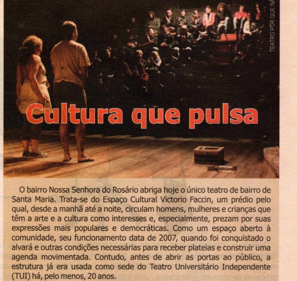 A presença de Clenio na construção de um sonho e sua materialização em um teatro foi nossa escola inicial. Com a gestão do ECVF, tivemos nossa alfabetização para além da linguagem cênica, foram os primeiros passos na articulação de produções independentes de outras pessoas. Agora era necessário uma agenda capaz de popularizar o espaço e criar estratégias para cativar o público, os grupos de teatro, os colegas de profissão e a cidade de Santa Maria, para o pleno funcionamento e continuidade dos nossos trabalhos.